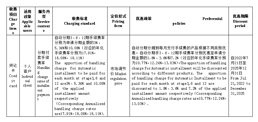 依据《商业银行服务价格管理办法》第四章第二十三条“商业银行设立新的实行市场调节价的服务收费项目,应当至少于实行前3个月按照本办法规定进行公示”的要求,我行现对新设立的信用卡分期付款手续费率之“自动分期”条款服务收费项目进行公示,公示时间自2022年4月20日至2022年7月20日止,收费标准及优惠政策等相关内容如下表: