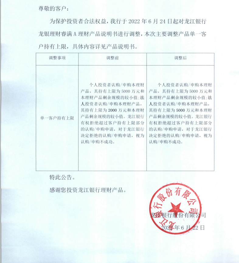 龙江银行龙银理财睿满A理财产品说明书调整的公告
