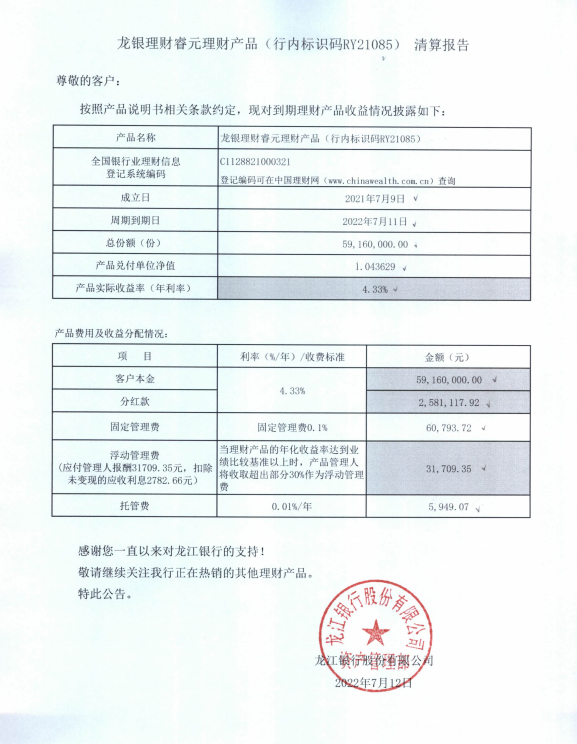 龙银理财睿元理财产品(行内标识码RY21085)清算报告