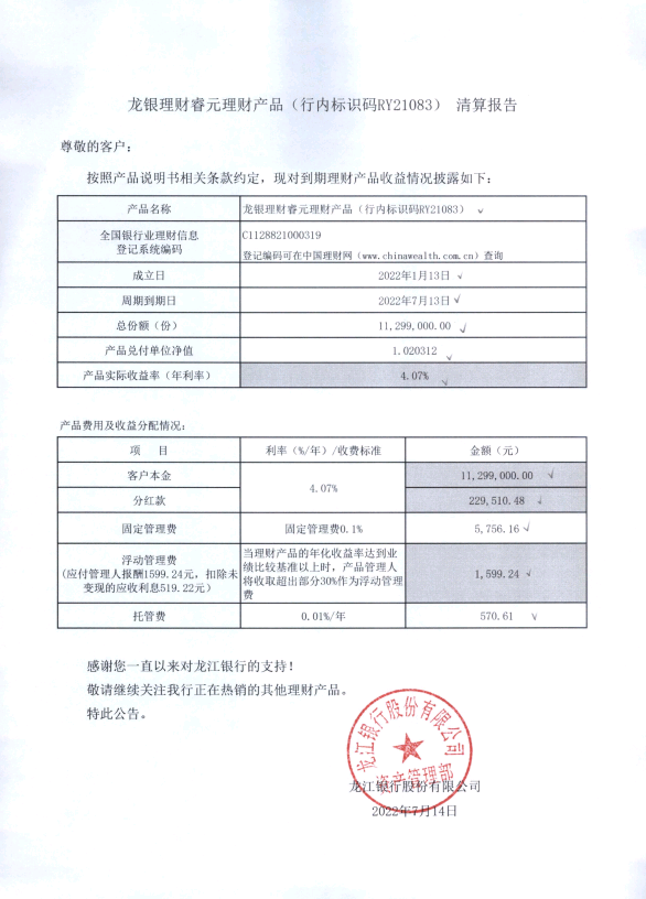 龙银理财睿元理财产品(行内标识码RY21083)清算报告
