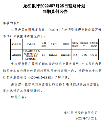 龙江银行2022年7月25日理财计划到期兑付公告