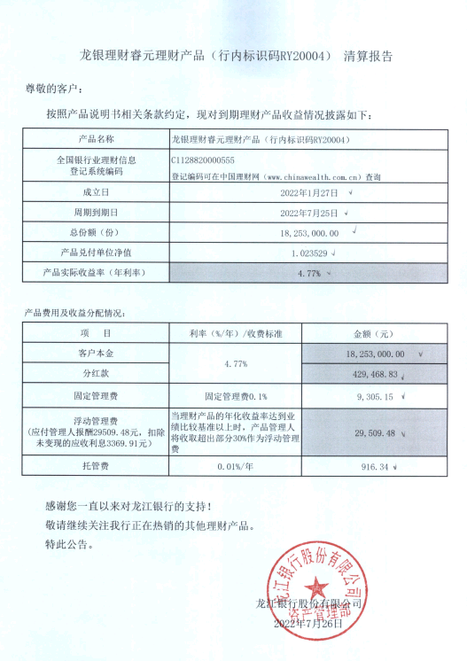 龙银理财睿元理财产品(行内标识码RY20004)清算报告