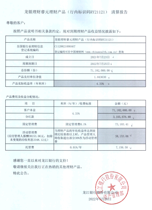 龙银理财睿元理财产品(行内标识码RY21121)清算报告