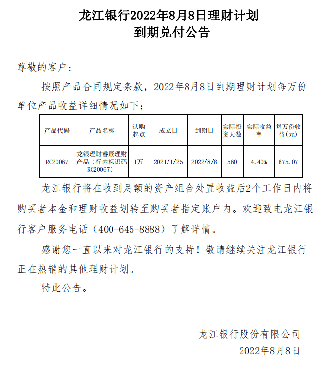 龙江银行2022年8月8日理财计划到期兑付公告