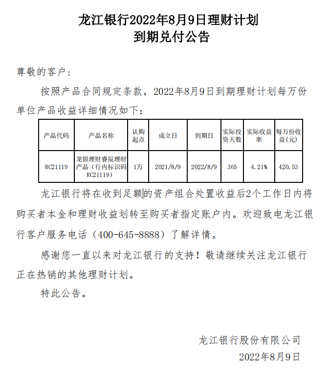 龙江银行2022年8月9日理财计划到期兑付公告