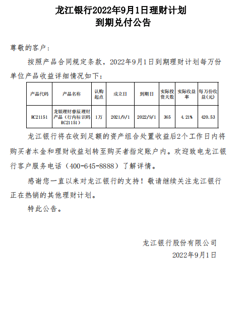 龙江银行2022年9月1日理财计划到期兑付公告