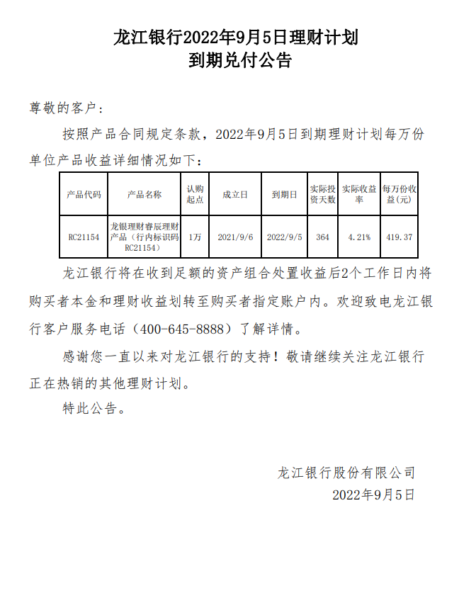 龙江银行2022年9月5日理财计划到期兑付公告