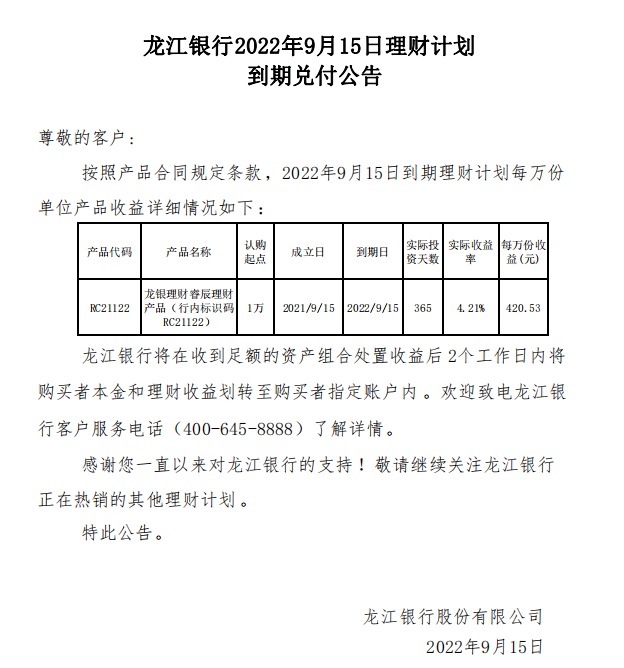 龙江银行2022年9月15日理财计划到期兑付公告