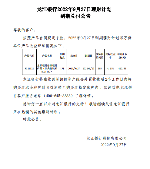 龙江银行2022年9月27日理财计划到期兑付公告