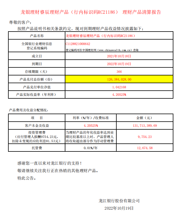 龙银理财睿辰理财产品RC21186号理财产品清算报告