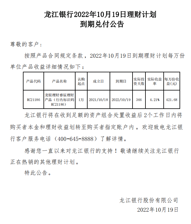 龙江银行2022年10月19日理财计划到期兑付公告