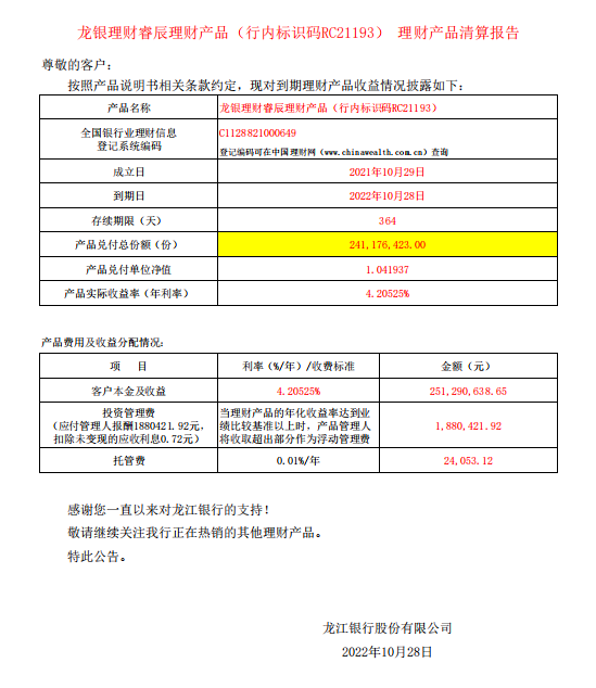 20221028龙银理财睿辰理财产品RC21193号理财产品清算报告