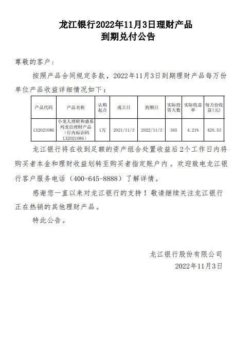 龙江银行2022年11月3日理财产品到期兑付公告