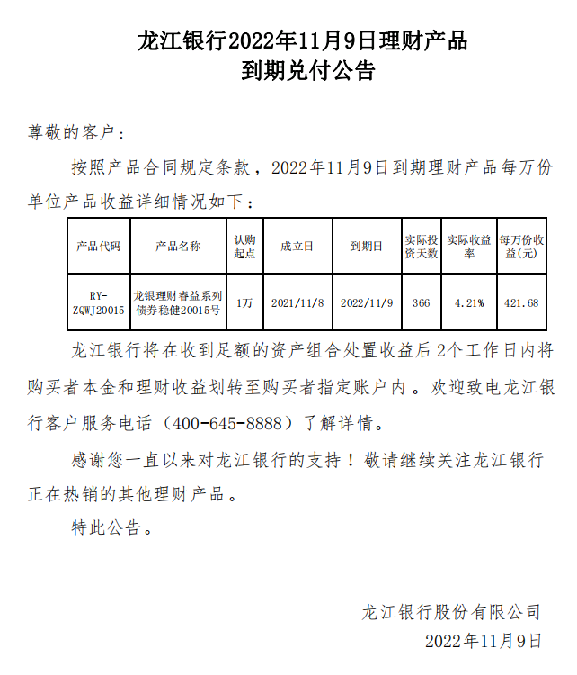 龙江银行2022年11月9日理财产品到期兑付公告