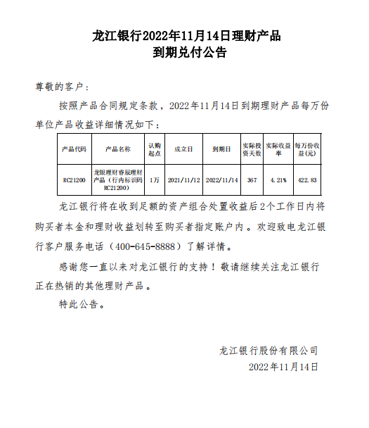 龙江银行2022年11月14日理财产品到期兑付公告