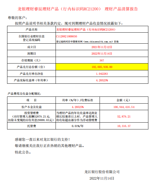 龙银理财睿辰理财产品RC21200号理财产品清算报告