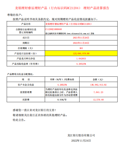 龙银理财睿辰理财产品RC21204号理财产品清算报告