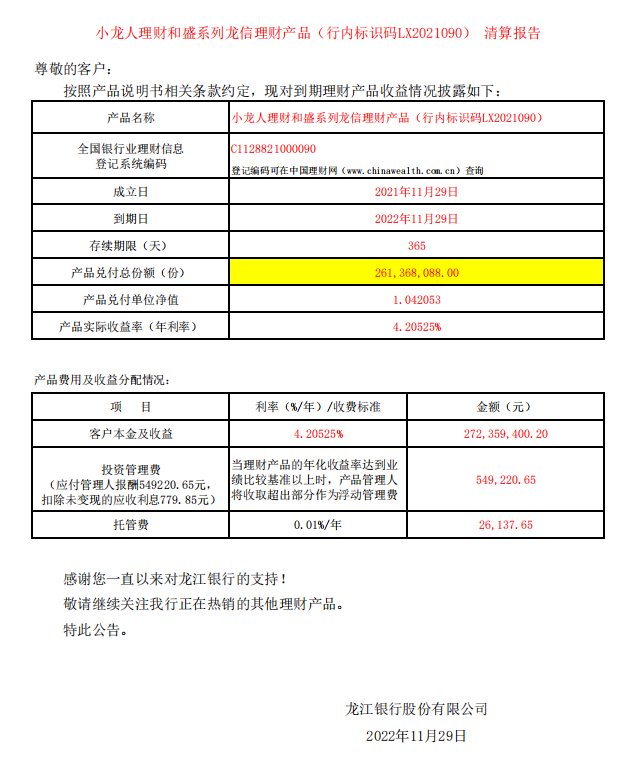 20221129小龙人理财和盛系列龙信理财产品LX2021090清算报告