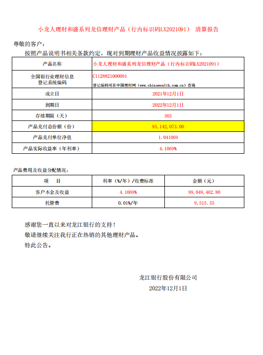 20221201小龙人理财和盛系列龙信理财产品LX2021091清算报告