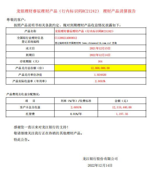龙银理财睿辰理财产品RC21242号理财产品清算报告