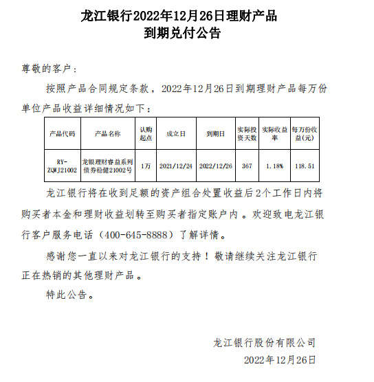 龙江银行2022年12月26日理财产品到期兑付公告