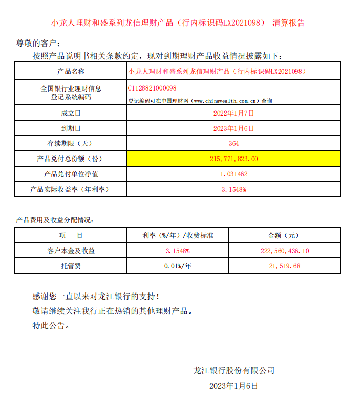 小龙人理财和盛系列龙信理财产品LX2021098清算报告