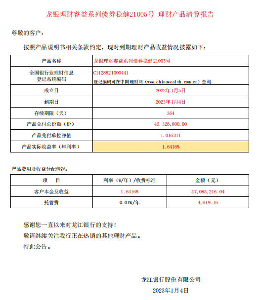 龙银理财睿益系列债券稳健21005号理财产品清算报告