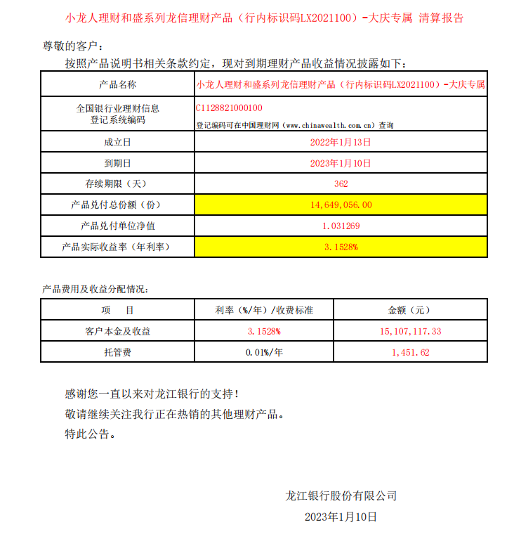 小龙人理财和盛系列龙信理财产品(行内标识码LX2021100)-大庆专属清算报告