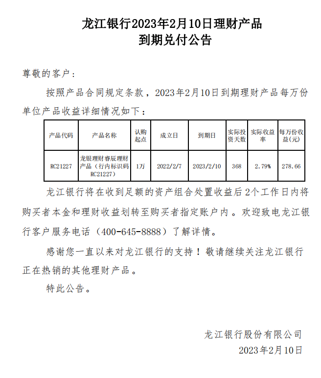 龙江银行2023年2月10日理财产品到期兑付公告