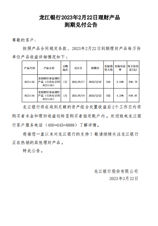 龙江银行2023年2月22日理财产品到期兑付公告
