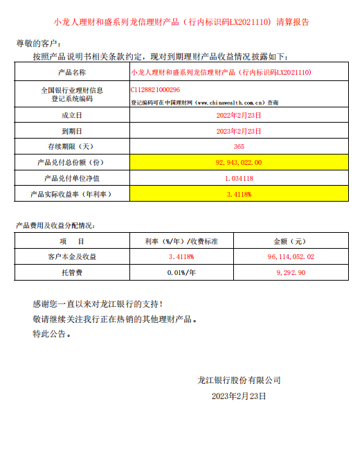 20230223小龙人理财和盛系列龙信理财产品LX2021110清算报告