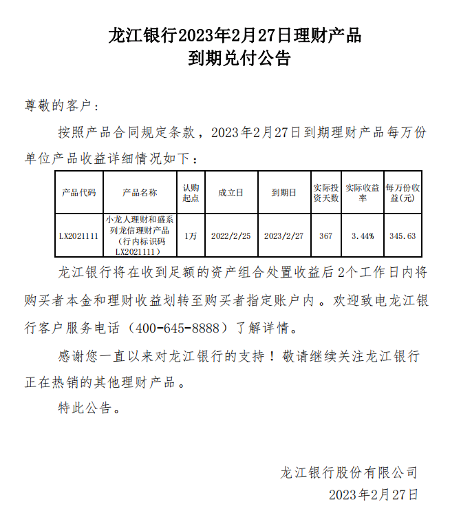 龙江银行2023年2月27日理财产品到期兑付公告