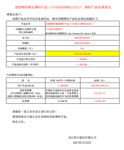 龙银理财睿辰理财产品RC21231号理财产品清算报告