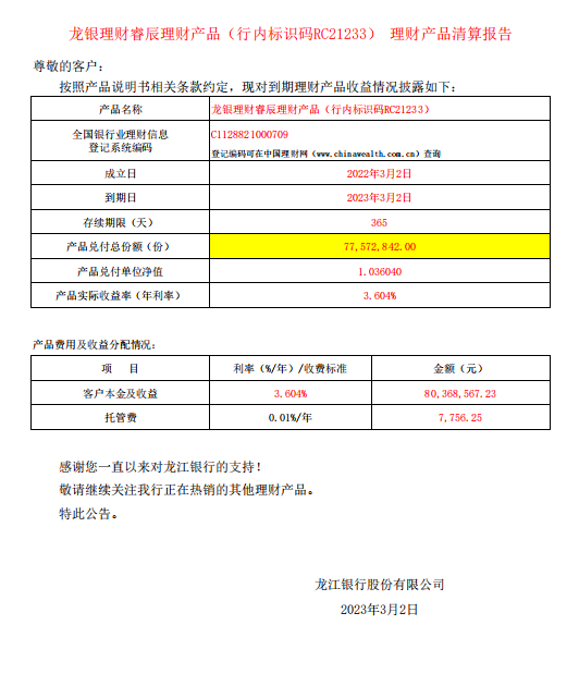 龙银理财睿辰理财产品RC21233号理财产品清算报告