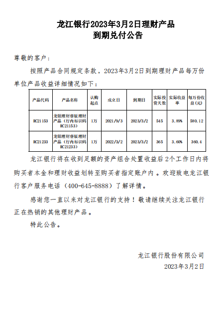 龙江银行2023年3月2日理财产品到期兑付公告