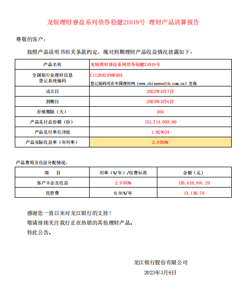 龙银理财睿益系列债券稳健21019号理财产品清算报告