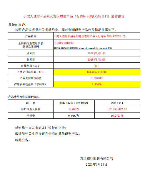 小龙人理财和盛系列龙信理财产品(行内标识码LX2021113) 清算报告