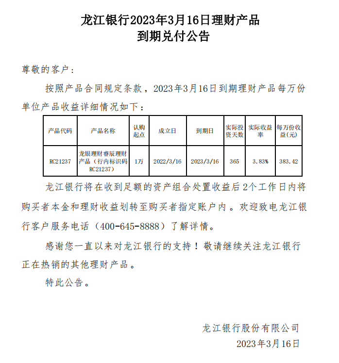 龙江银行2023年3月16日理财产品到期兑付公告(RC21237)