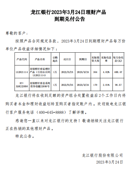 龙江银行2023年3月24日理财产品到期兑付公告