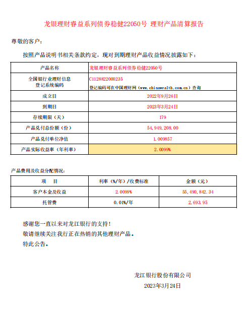 龙银理财睿益系列债券稳健22050号理财产品清算报告