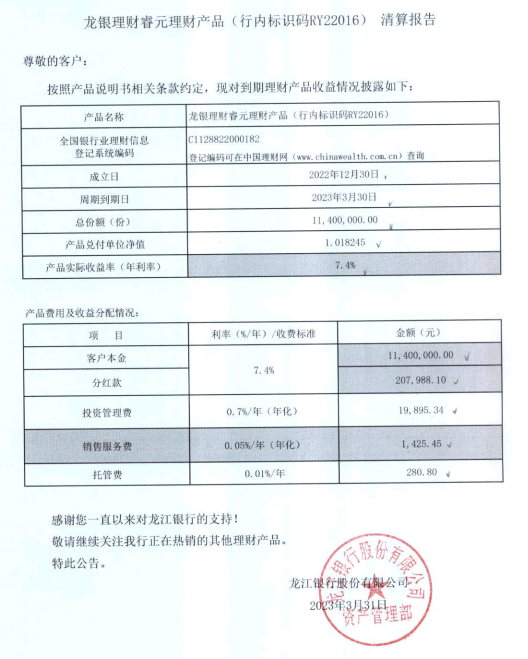龙银理财睿元理财产品(行内标识码RY22016)清算报告