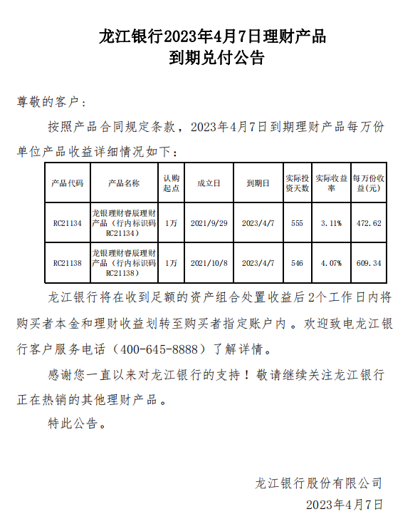 龙江银行2023年4月7日理财产品到期兑付公告