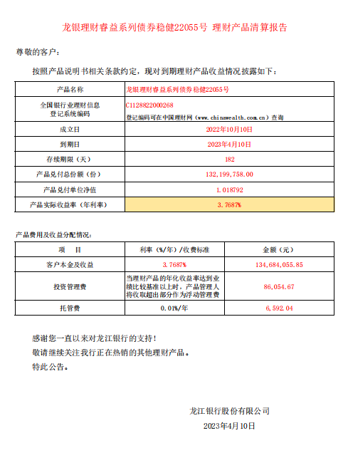 龙银理财睿益系列债券稳健22055号理财产品清算报告