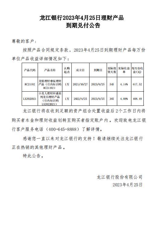 龙江银行2023年4月25日理财产品到期兑付公告