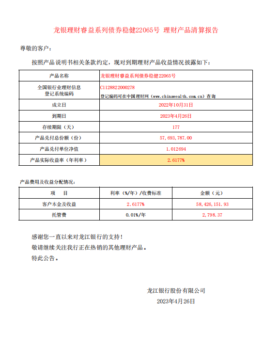 20230426龙银理财睿益系列债券稳健22065号理财产品清算报告