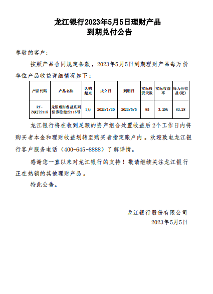 龙江银行2023年5月5日理财产品到期兑付公告