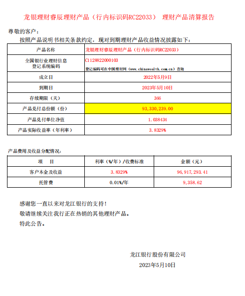 龙银理财睿辰理财产品(行内标识码RC22033) 理财产品清算报告