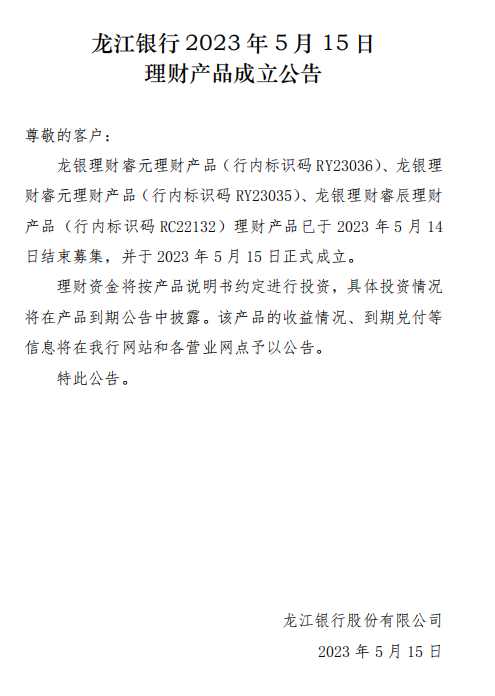 龙江银行2023年5月15日理财产品成立公告