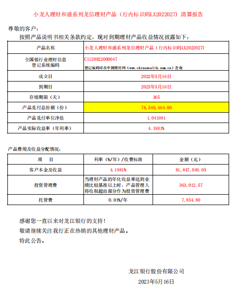 小龙人理财和盛系列龙信理财产品(行内标识码LX2022027) 清算报告