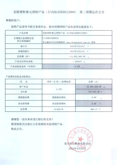 龙银理财睿元理财产品(行内标识码RY23008)第一周期运作公告